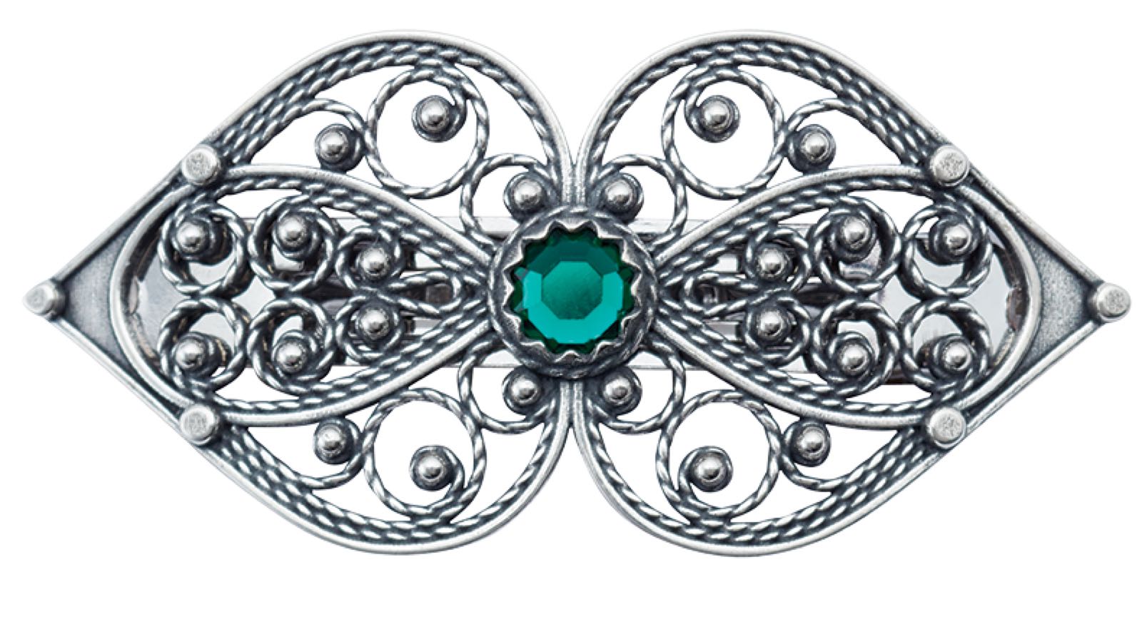 Hårspenne hjartefiligran med grøn stein, stort, oksidert