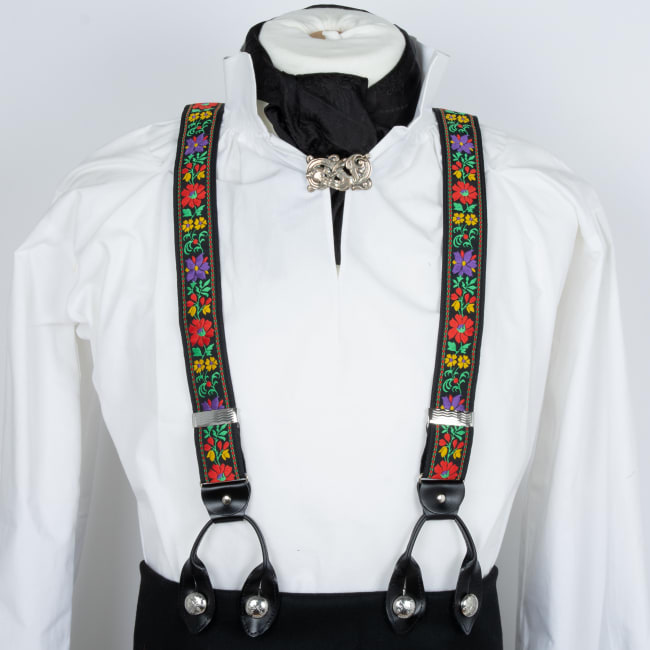 Bukseselar med jacquardvevd band. Lengda kan reguleras med sylvbelagt spenne. Elastisk strikk på ryggpartiet.