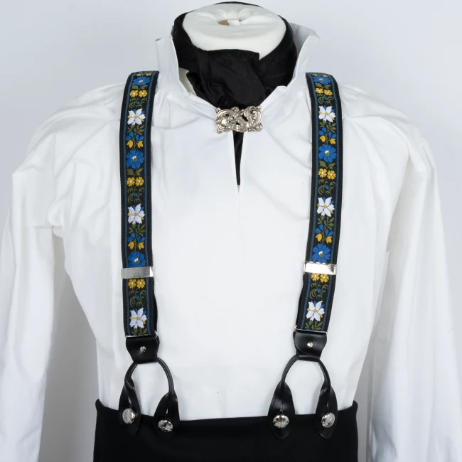 Bukseseler med jacquardvevd bånd. Lengden kan reguleres med sølvbelagt spenne. Elastisk strikk på ryggpartiet.