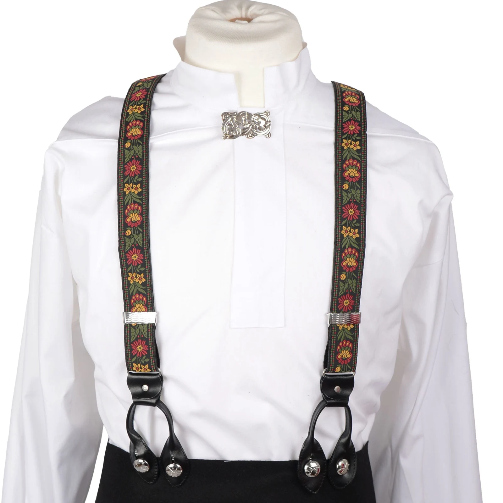Bukseselar med jacquardvevd band. Lengda kan reguleras med sylvbelagt spenne. Elastisk strikk på ryggpartiet.